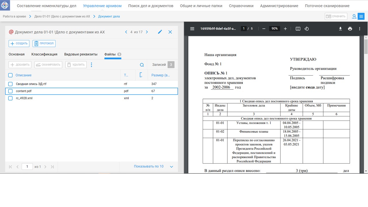 Все документы электронного дела после импорта в систему «ХРОНИКА» становятся доступны для просмотра в полном объеме в соответствии с правами пользователей. Для долгосрочного архивного хранения и обеспечения доступа к документам даже в случае невозможности воспроизведения исходного формата файла, автоматически создается специальный файл в формате PDF/A. Этот файл содержит визуализацию всех файлов документа. Кроме того, в состав документа входят архивный файл с информацией об электронных подписях и xml-файл с метаданными регистрационной карточки документа из системы оперативного делопроизводства.