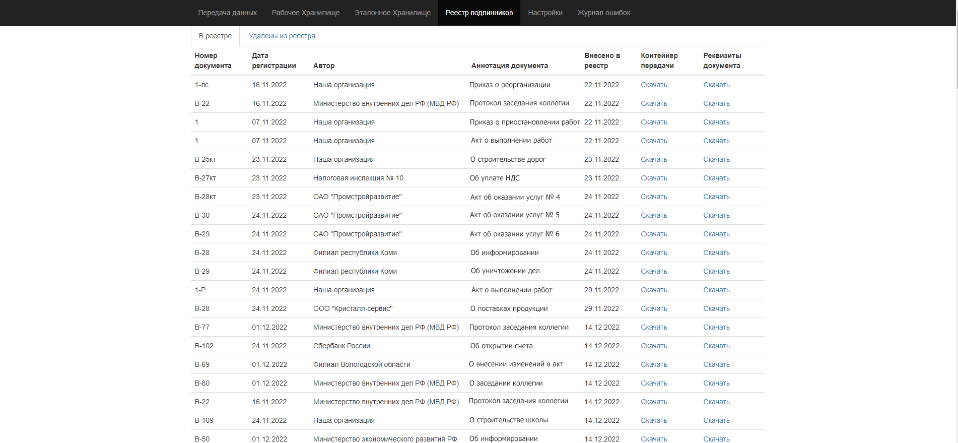 - Внесение электронных документов в реестр подлинников, который формируется на основе записей из закрытого эталонного хранилища.