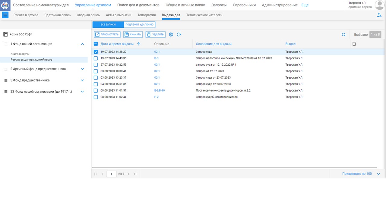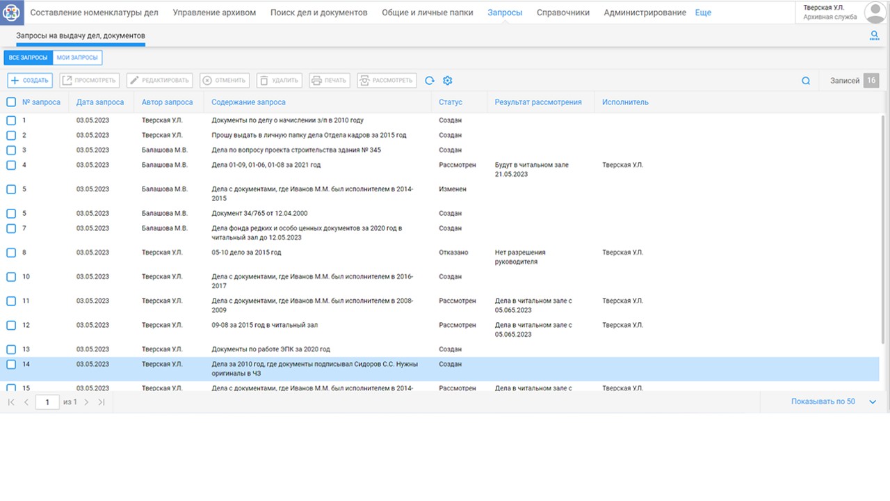 Система предлагает удобные инструменты для запросов на выдачу документов из архива. Она автоматизирует регистрацию и учет запросов, позволяя быстро находить нужные материалы. Пользователи легко отслеживают статус своих запросов, что делает процесс прозрачным и ускоряет работу с архивными данными.