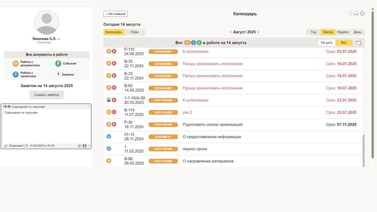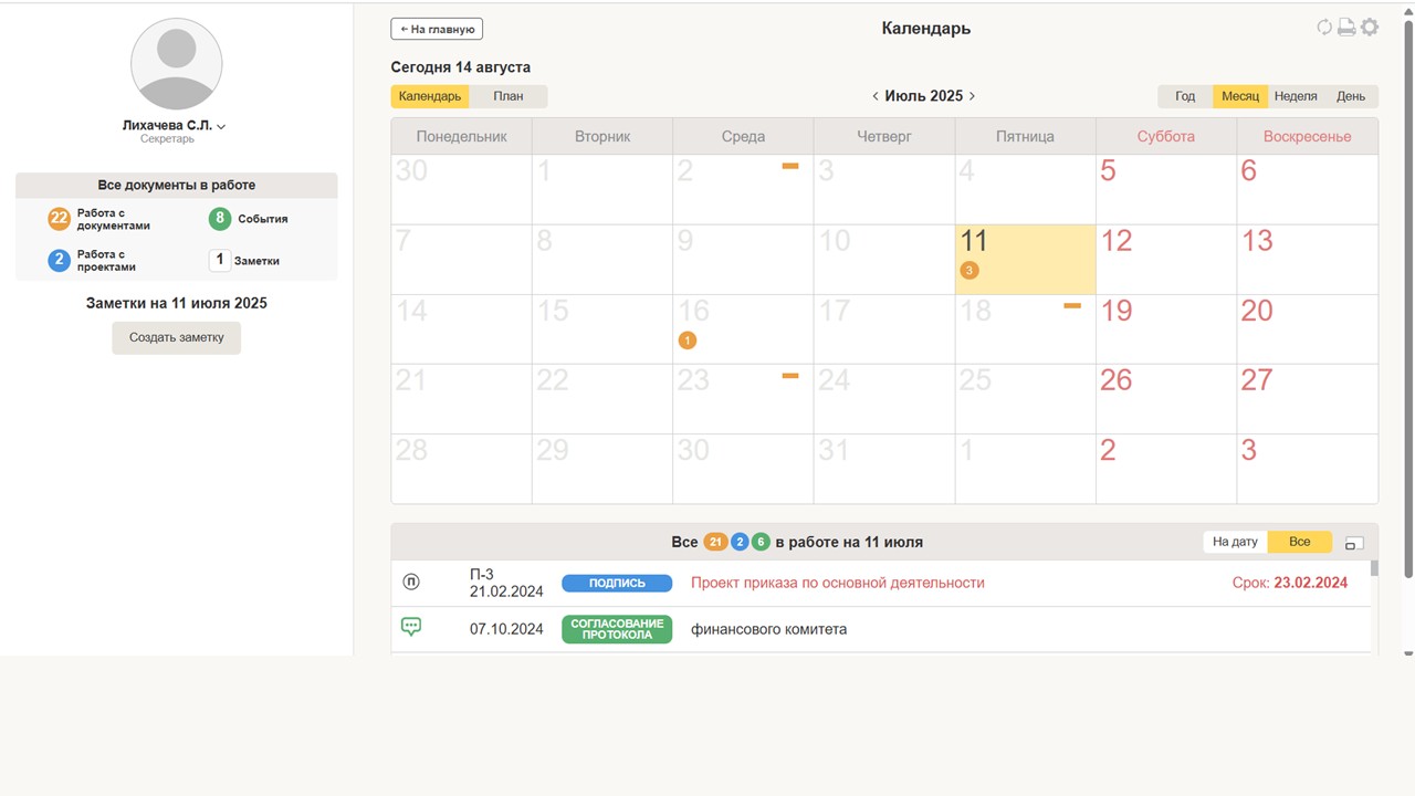 Кроме того, система позволяет создавать личные и групповые заметки, которые также отображаются в календаре. Это дает возможность формировать произвольные заметки как для личного использования, так и для совместной работы с коллегами. Заметки могут содержать ссылки на документы или проекты, что упрощает доступ к необходимой информации.