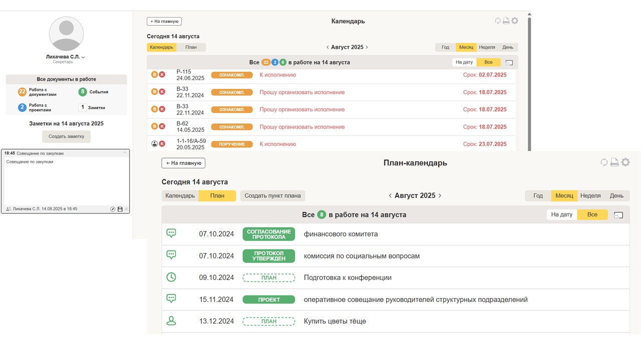 Модуль «План-календарь» предоставляет удобные инструменты для управления документами, проектами и поручениями, позволяя пользователям эффективно планировать и отслеживать свою деятельность. С помощью данного модуля можно просматривать информацию в различных временных интервалах, что обеспечивает гибкость в управлении задачами. Пользователи могут легко переходить к работе с выбранными документами прямо из интерфейса календаря, что значительно упрощает процесс.