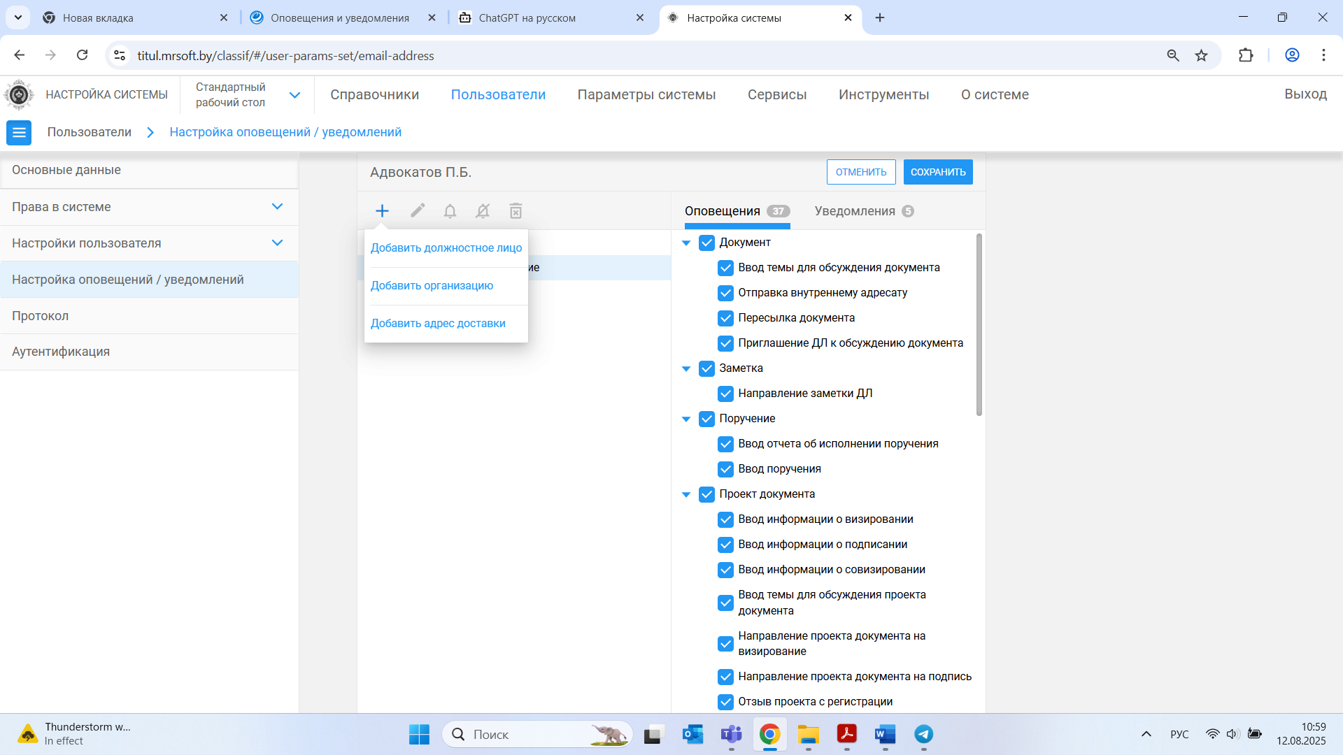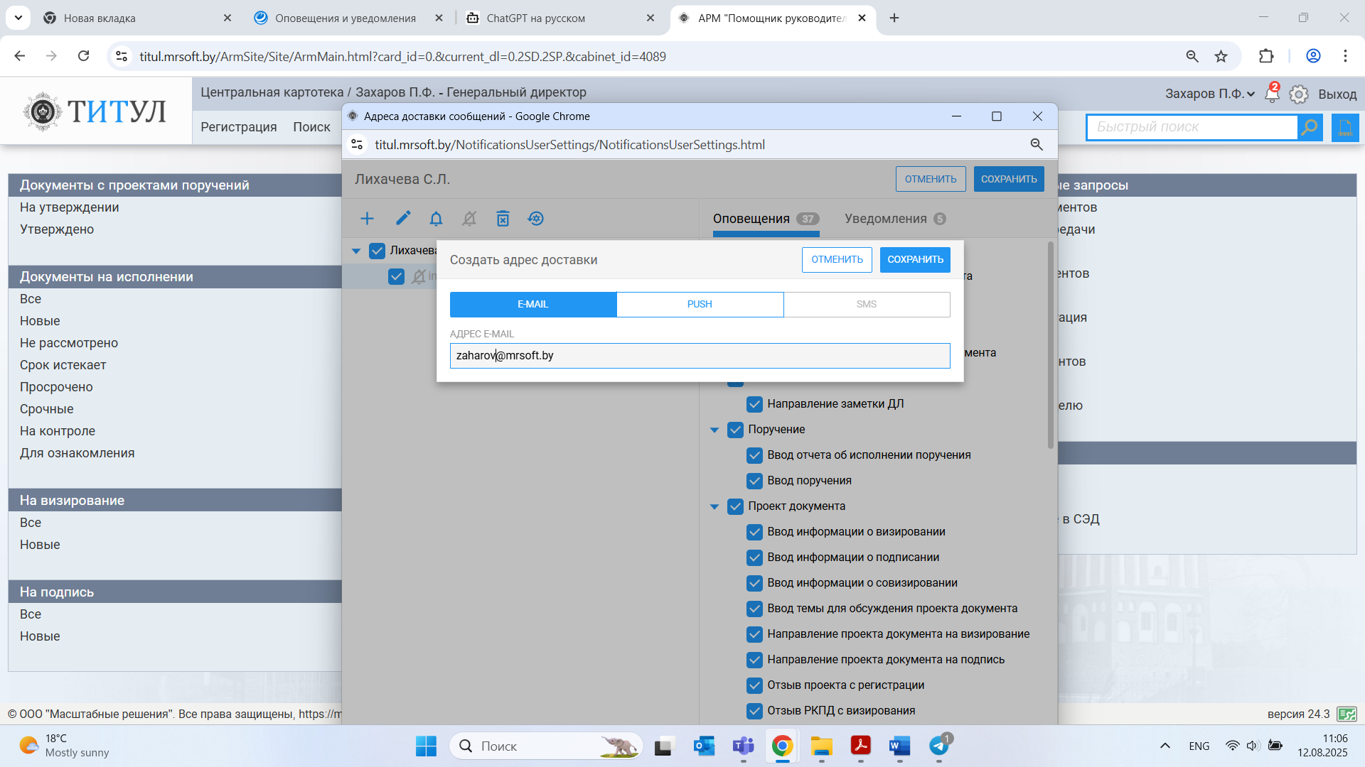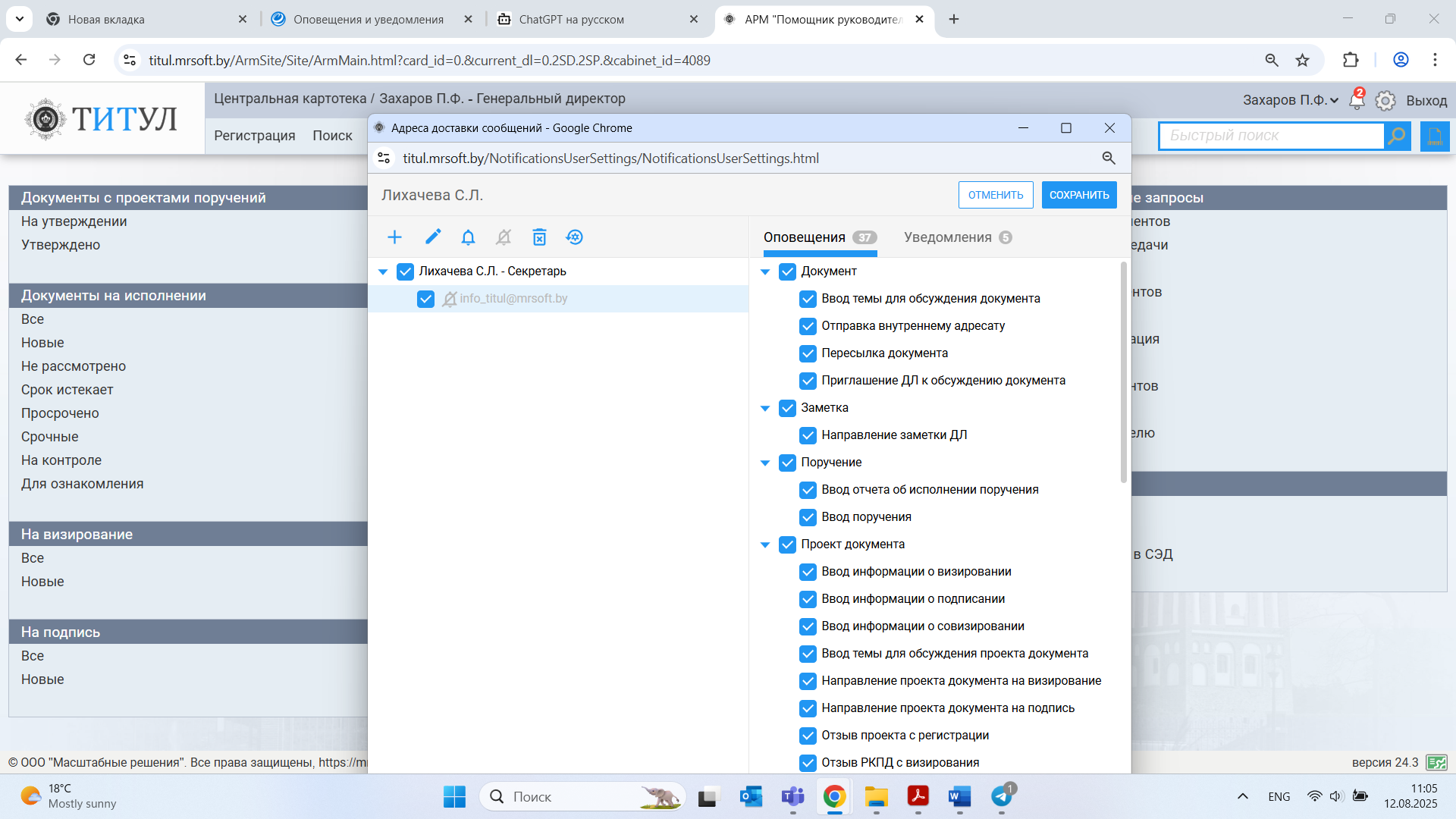 Опция «Оповещения и уведомления» в СЭД «ТИТУЛ» обеспечивает информирования пользователей о различных событиях в системе, изменениях статуса документов, о предстоящих задачах и сроках их выполнения. Благодаря автоматической рассылке уведомлений, время, затрачиваемое на информирование исполнителей, существенно сокращается. Это снижает вероятность срыва сроков исполнения поручений и пропуска важных событий, что особенно актуально в условиях высокой нагрузки.