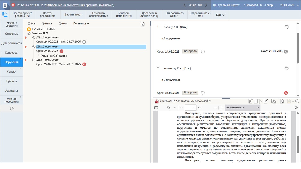 Пользователи могут самостоятельно создавать любые поисковые запросы с помощью конструктора поисковых форм. Сформированные отчеты могут быть распечатаны или представлены в виде интерактивной таблицы с возможностью семантического зума и выбора уровня детализации, вплоть до конкретного документа и поручения.