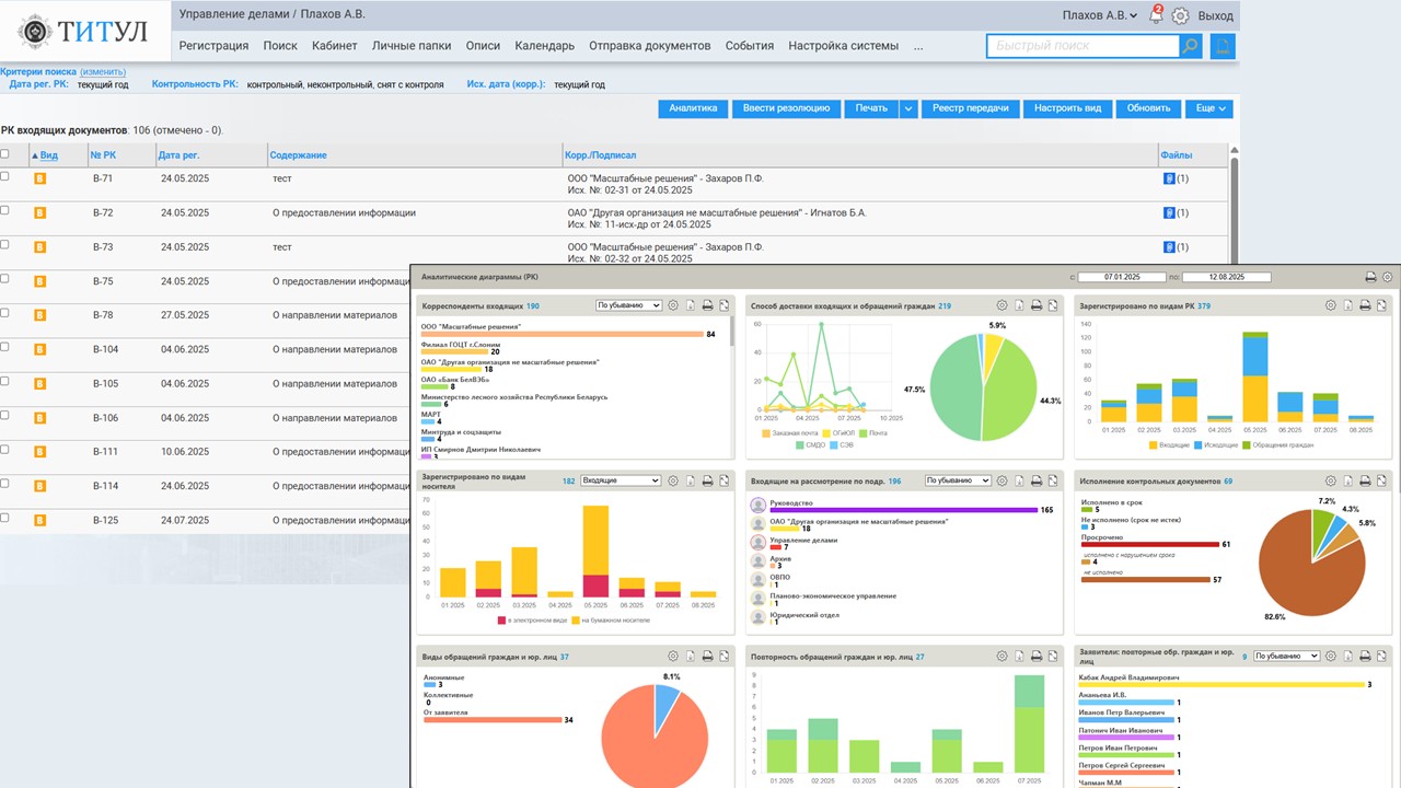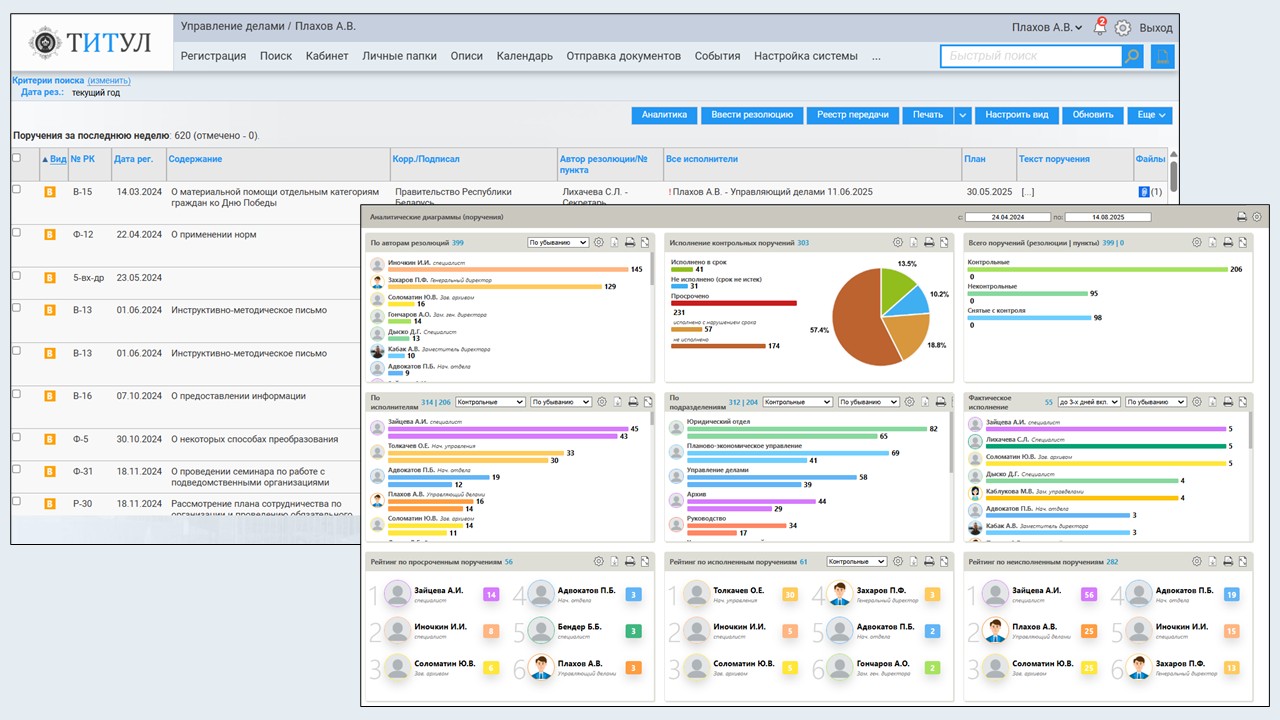 Наглядная визуализация ключевых показателей по документообороту и исполнению поручений осуществляется с помощью динамически обновляемых диаграмм. Пользователи могут видеть сводки по исполнению, количество неисполненных в срок поручений и распределение задач по сотрудникам, что способствует более эффективному управлению и анализу работы.
