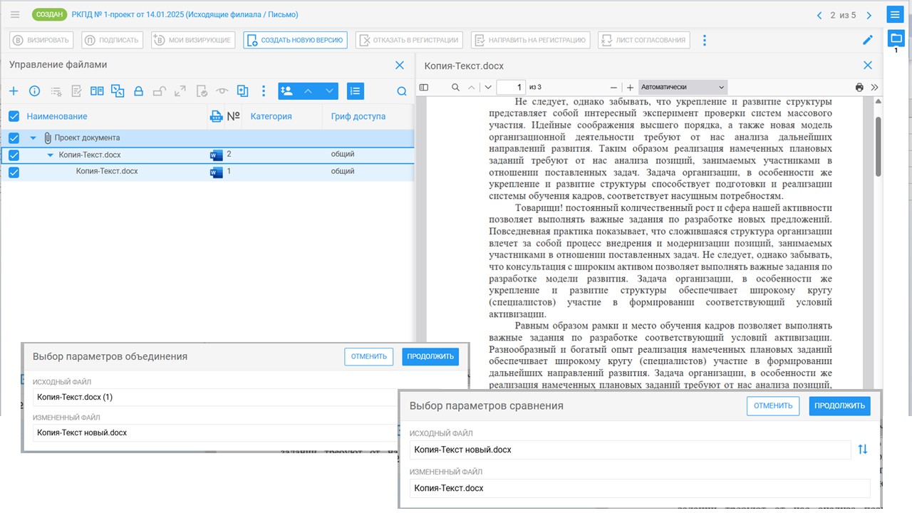 Таким образом, функционал «Редактирование файлов» в СЭД «ТИТУЛ» представляет собой мощный инструмент, способствующий оптимизации рабочих процессов, повышению эффективности взаимодействия и обеспечению надежного контроля над документооборотом. Это делает систему не только удобной, но и высокопродуктивной, что соответствует современным стандартам и требованиям в области управления документацией.
