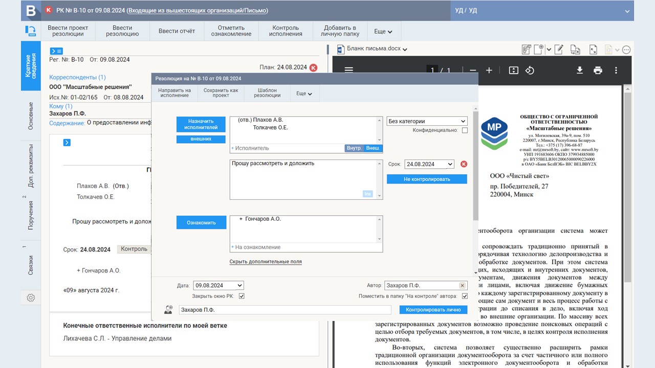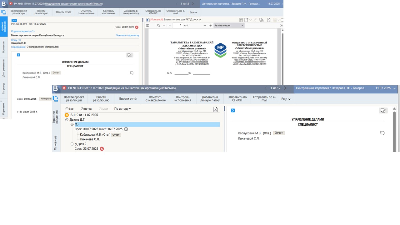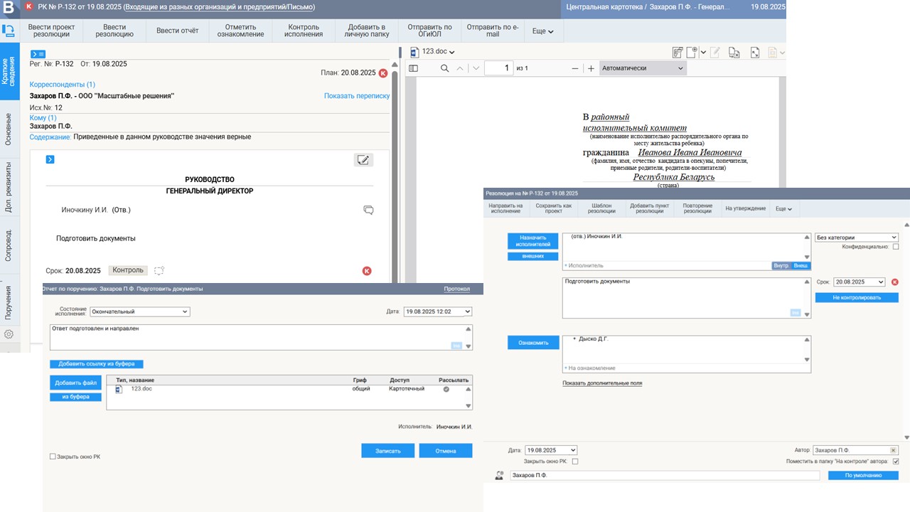 - Выдачу поручений и работу с проектами резолюций