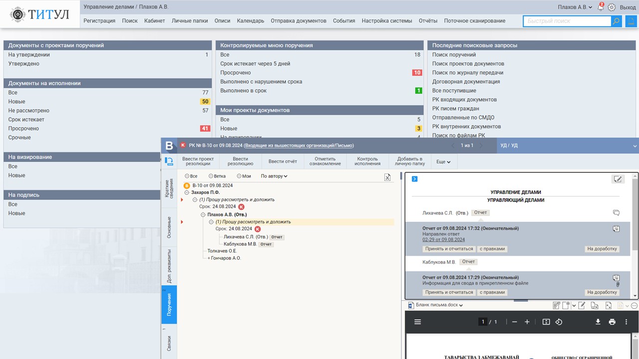 Система электронного документооборота «ТИТУЛ» обеспечивает управление документами на всех этапах жизненного цикла — от регистрации до списания, в соответствии с утвержденной номенклатурой дел.