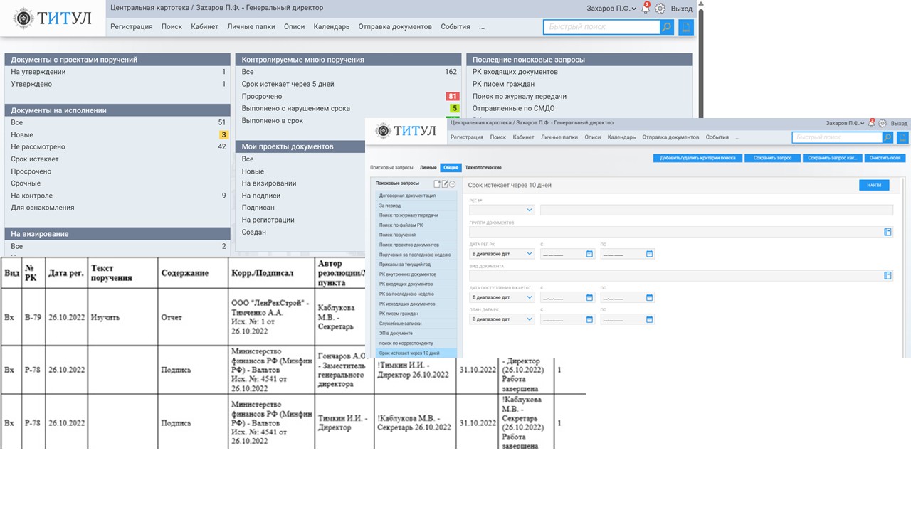 СЭД «ТИТУЛ» позволяет оперативно получить доступ к необходимым документам и истории работы с ними. В системе предусмотрен быстрый поиск по номеру, дате, тексту документа, другим параметрам.