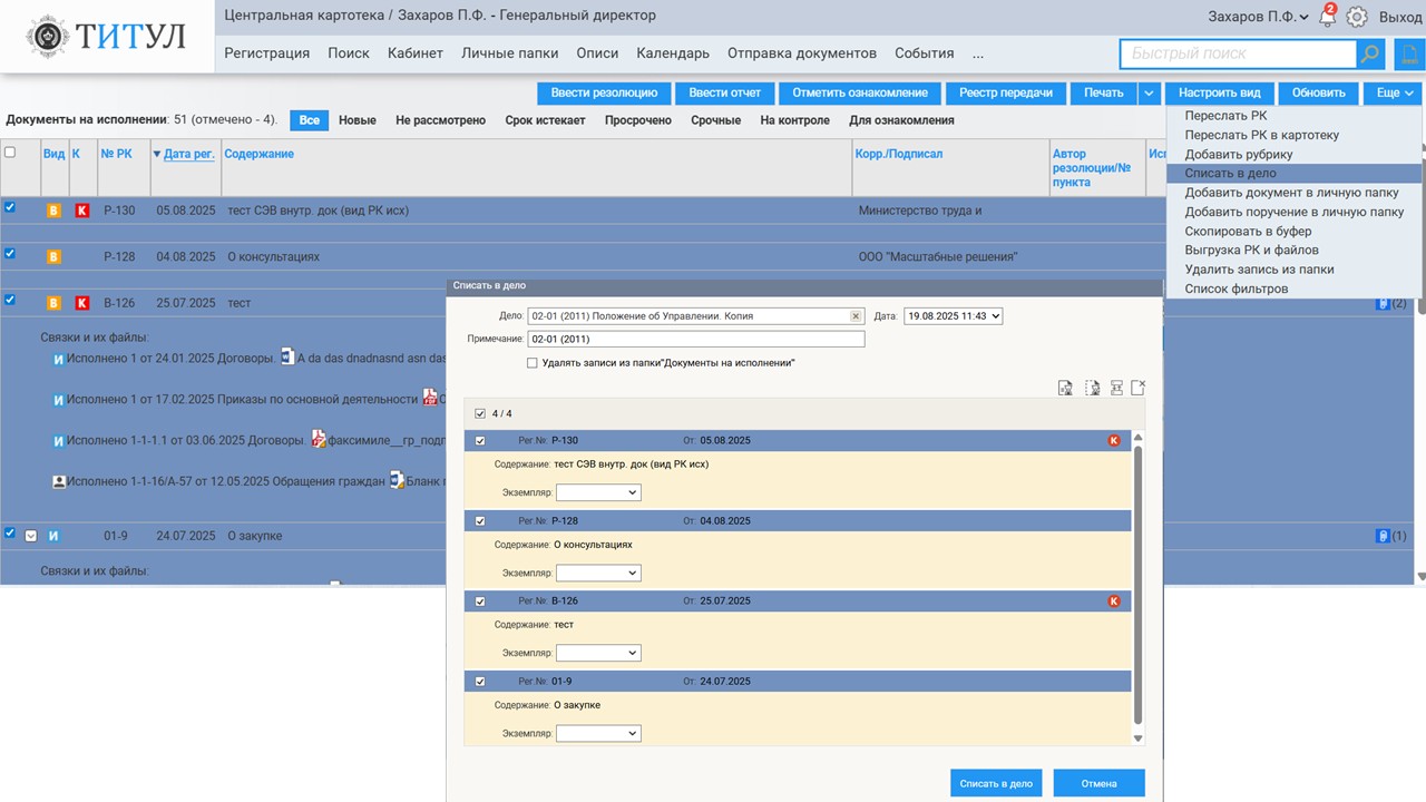 - Списание документов в дела