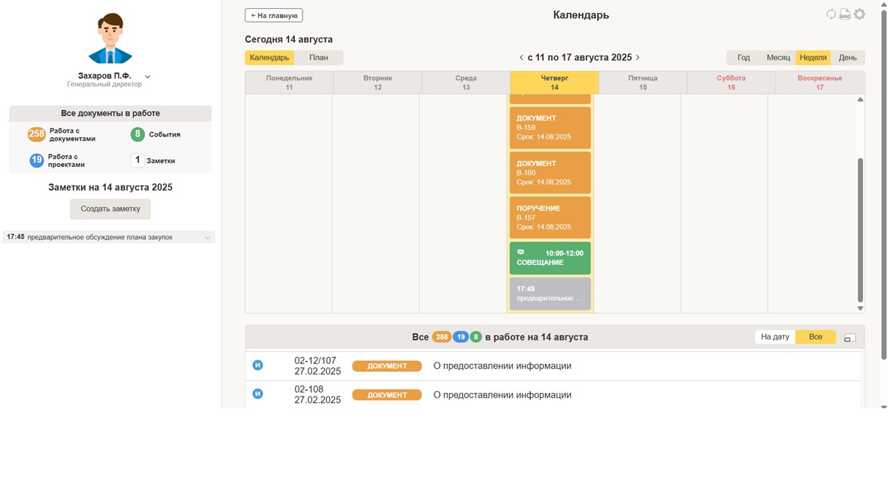 Система предоставляет широкий набор инструментов для управления личными и групповыми календарями. Это помогает пользователям эффективно распределять время и планировать мероприятия. В календаре отображаются даты совещаний, сроки выполнения задач, подготовки документов и других важных событий. Просторный и понятный интерфейс облегчает выбор удобного времени для встреч, учитывая занятость участников. Система также связывает события с соответствующими документами или проектами, что упрощает работу.