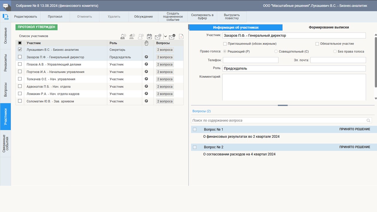 Формирование повестки и информирование участников — важный аспект работы системы. Участники предстоящих совещаний получают оперативный доступ к материалам мероприятий, а также к архивным данным предыдущих совещаний. Система предоставляет удобный интерфейс для формирования и утверждения повестки совещания, позволяя добавлять и исключать вопросы, согласовывать изменения и уведомлять участников о всех обновлениях.