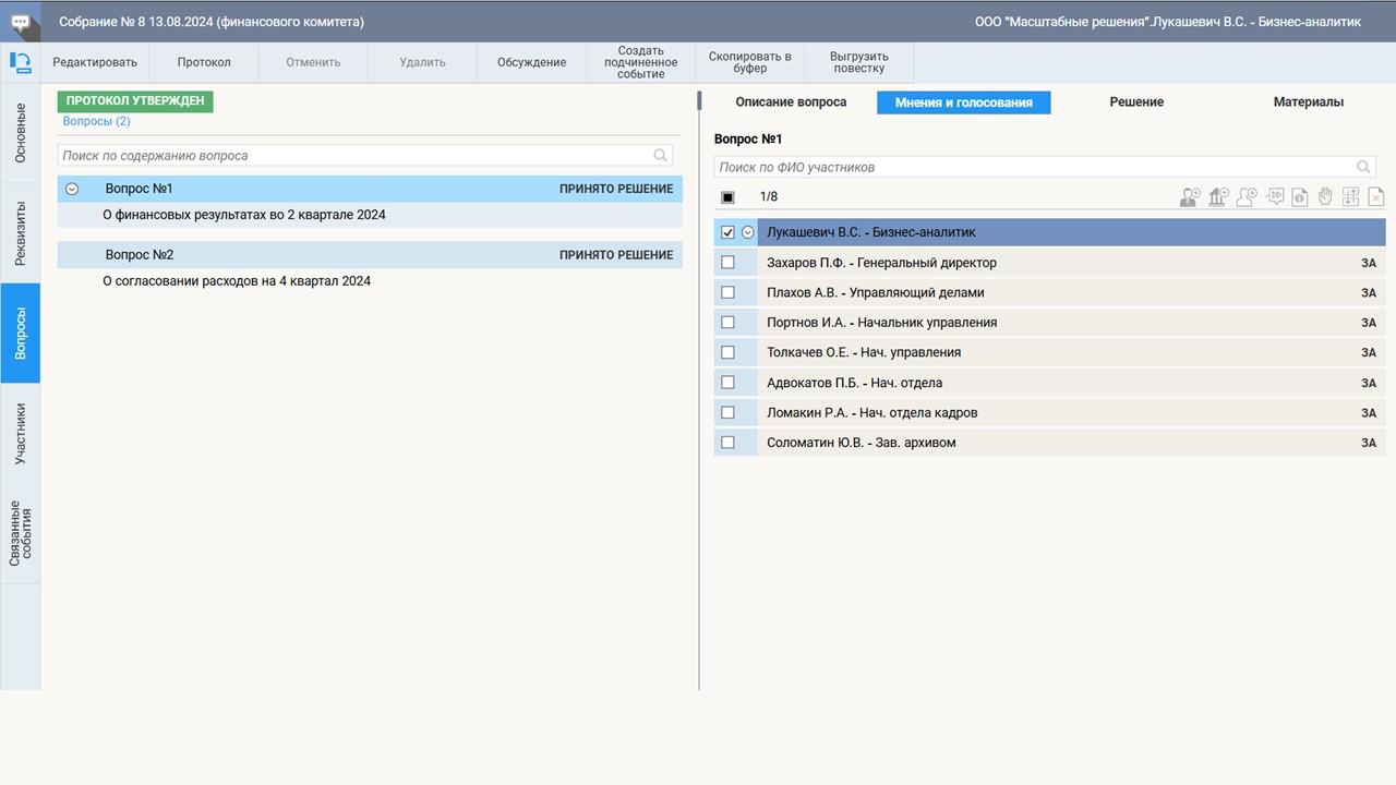 Проведение совещаний и голосований также реализовано на высоком уровне. СЭД «ТИТУЛ» позволяет фиксировать результаты обсуждений как на очных мероприятиях, так и в режиме удаленного участия, включая возможность голосования по вопросам повестки. Система автоматически оформляет решения совещания с подсчетом голосов, а также обеспечивает подготовку и утверждение протокола совещания, который затем регистрируется и предоставляется сотрудникам для ознакомления с учетом установленных прав доступа.