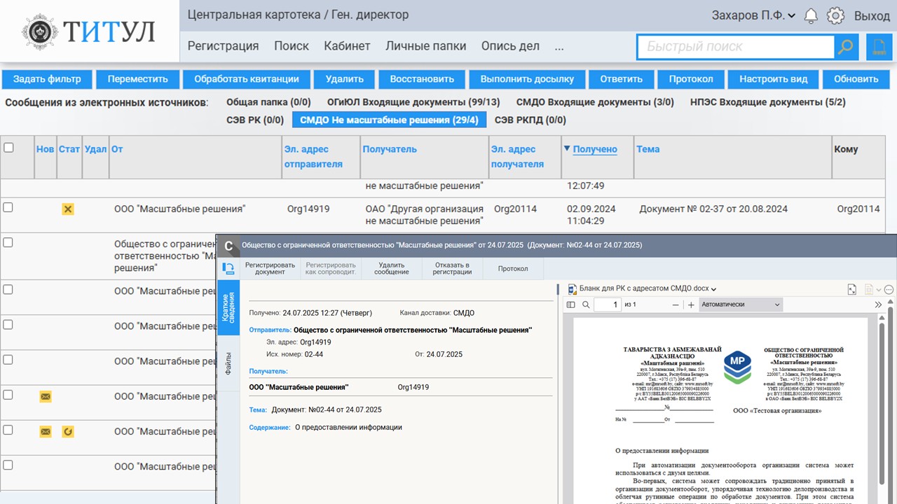 Для регистрации документов, поступающих по различным каналам связи пользователю достаточно перейти в специальный раздел личного кабинета «Регистрация из электронных источников». Такое решение является эффективным и удобным для пользователей поскольку исключает необходимость открытия разных клиентских приложений.