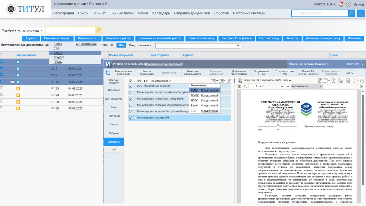 Отправка документов по электронным каналам (СМДО, система обращений, электронная почта) может осуществляться подокументно или групповым способом из соответствующего раздела СЭД. Пользователям, ответственным за отправку документов, могут быть предоставлены права отправки по одному или нескольким каналам.