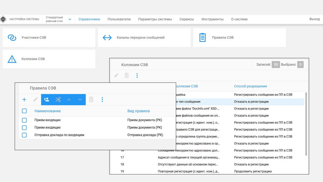 При настройке обмена документам между удаленными подразделениями с помощью опции СЭВ устанавливаются параметры автоматической регистрации. При возникновении коллизий (невозможности выполнения условий автоматической регистрации) документы будут попадать на ручную регистрацию в специальную папку пользователю, ответственному за регистрацию.