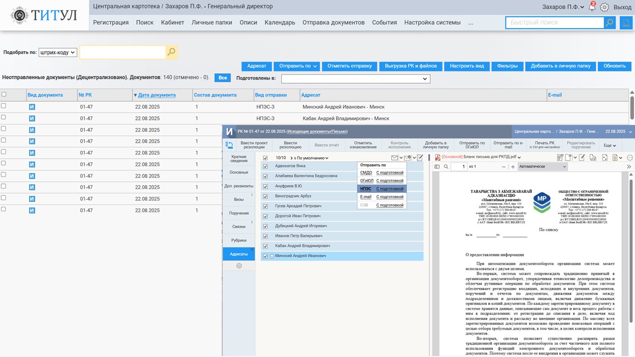 - Формирование списка адресатов: после создания документа формируется список адресатов, что позволяет отправить одно и то же письмо нескольким получателям одновременно.