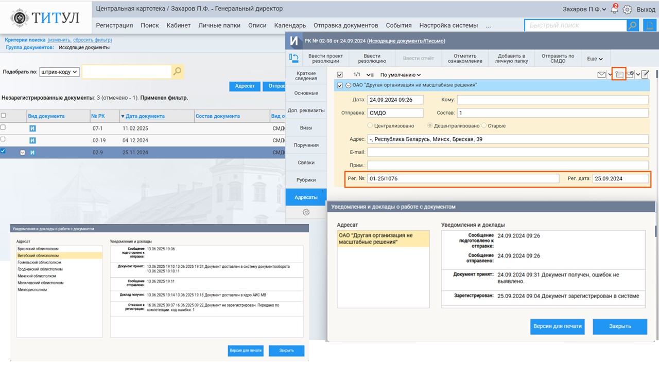 Для документов, поступивших по СМДО выполняется проверка действительности ЭЦП, проверка повторности, а также проверка соответствия поступивших полученных файлов форматам PDF/A1 (PDF/A2). Полученные документы регистрируются как входящие в системе «ТИТУЛ» с созданием регистрационной карточки соответствующей группы, с автоматическим заполнением реквизитов документа и прикреплением полученных файлов. Таким образом, поступающие по СМДО документы обрабатываются в СЭД в соответствии с общими правилами документооборота организации и не нарушают сложившиеся процессы и регламенты работы с ними.