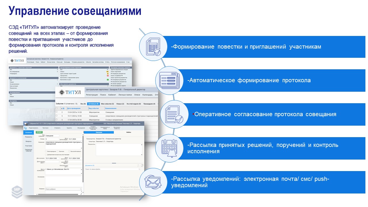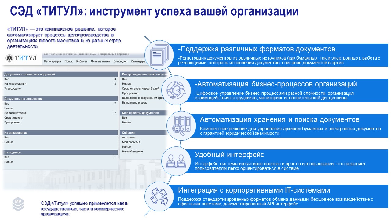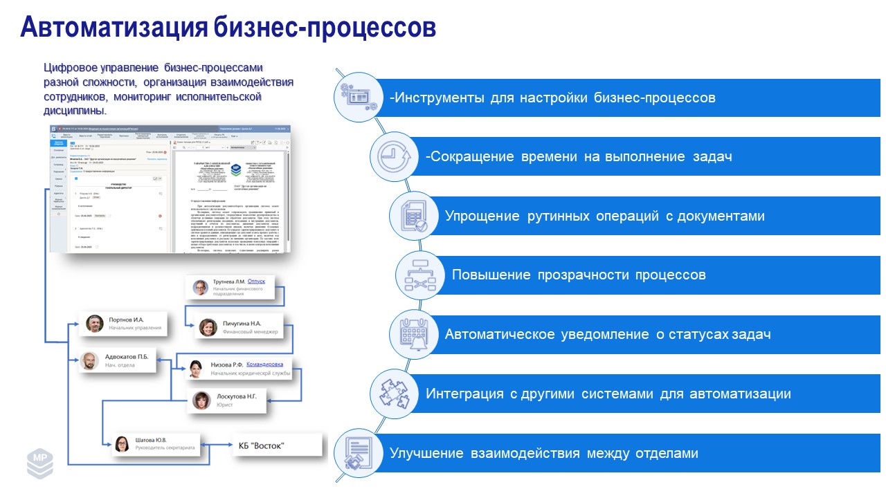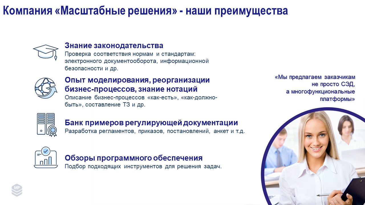 Модуль интеграции с НПЭСМодуль интеграции с «Системой обращений»Взаимодействие с СМДОМобильное приложение MRmobileОповещения и уведомленияЗамещение должностейУправление совещаниямиОтчетность и аналитикаКалендарное представлениеМодуль «Печатные формы»Наглядные инструменты настройкиПоиск документовЭлектронная цифровая подписьРедактирование файловКонструктор маршрутовПодготовка и согласование документовДоговорной документооборотВнешний документооборотУправление документами