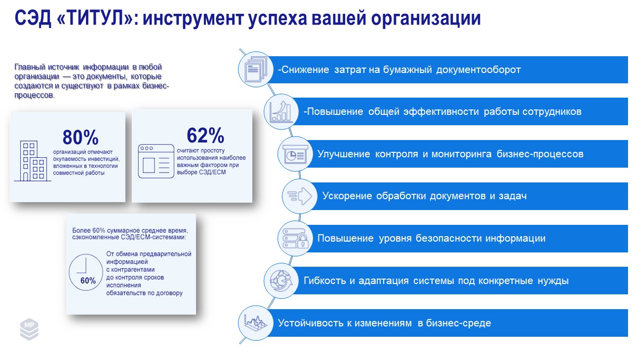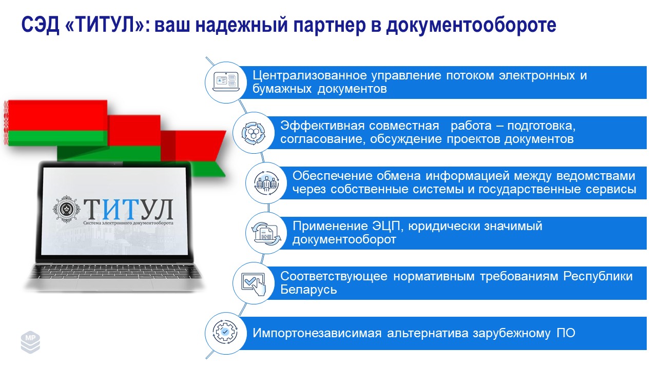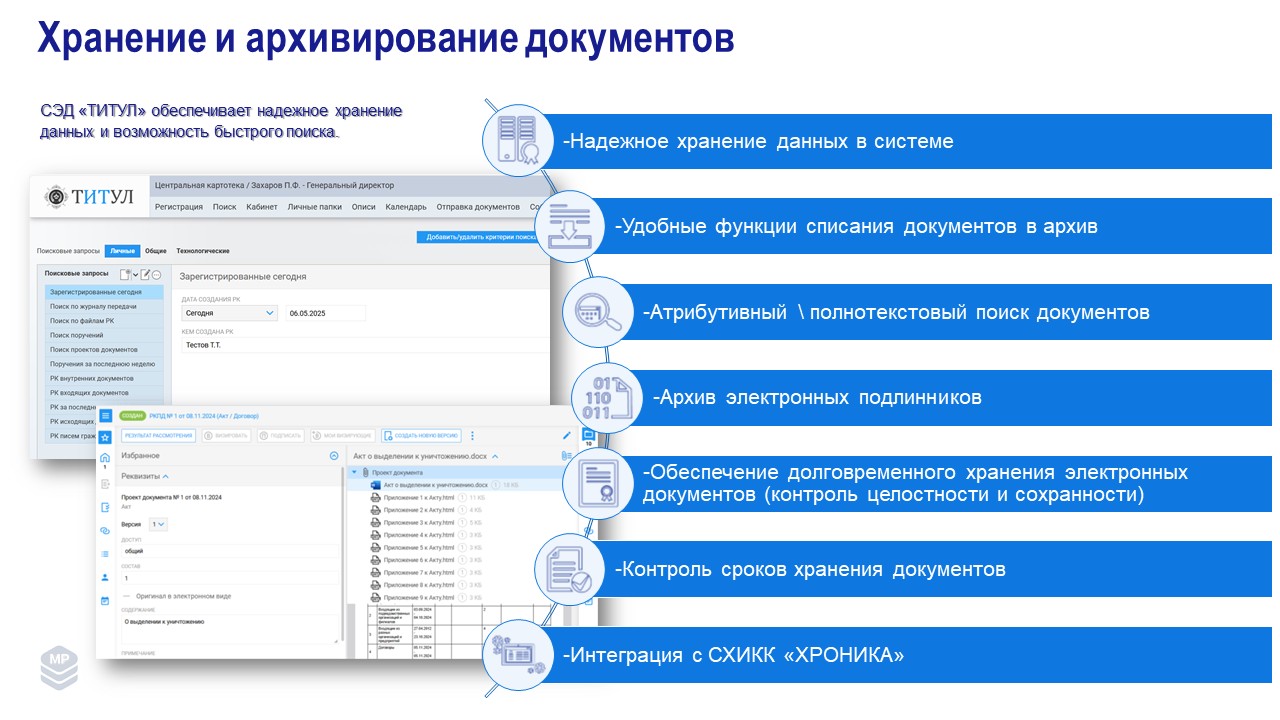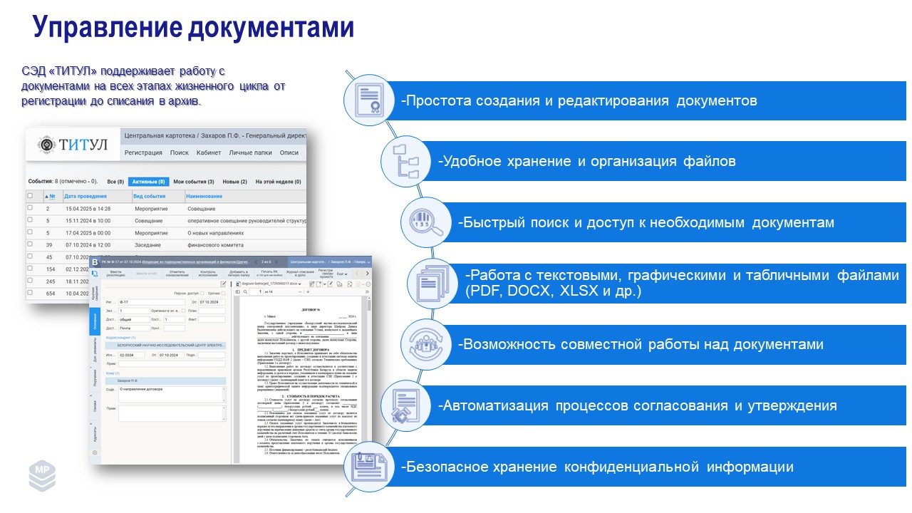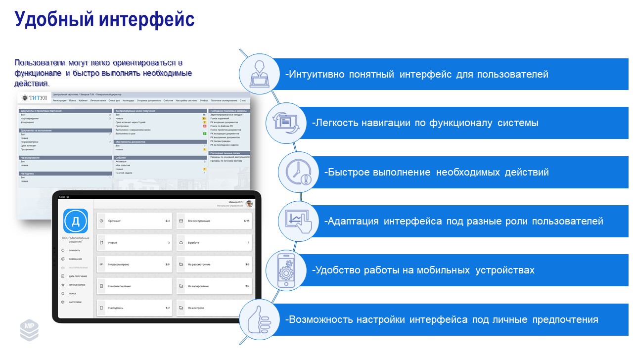 Модуль интеграции с НПЭСМодуль интеграции с «Системой обращений»Взаимодействие с СМДОМобильное приложение MRmobileОповещения и уведомленияЗамещение должностейУправление совещаниямиОтчетность и аналитикаКалендарное представлениеМодуль «Печатные формы»Наглядные инструменты настройкиПоиск документовЭлектронная цифровая подписьРедактирование файловКонструктор маршрутовПодготовка и согласование документовДоговорной документооборотВнешний документооборотУправление документами